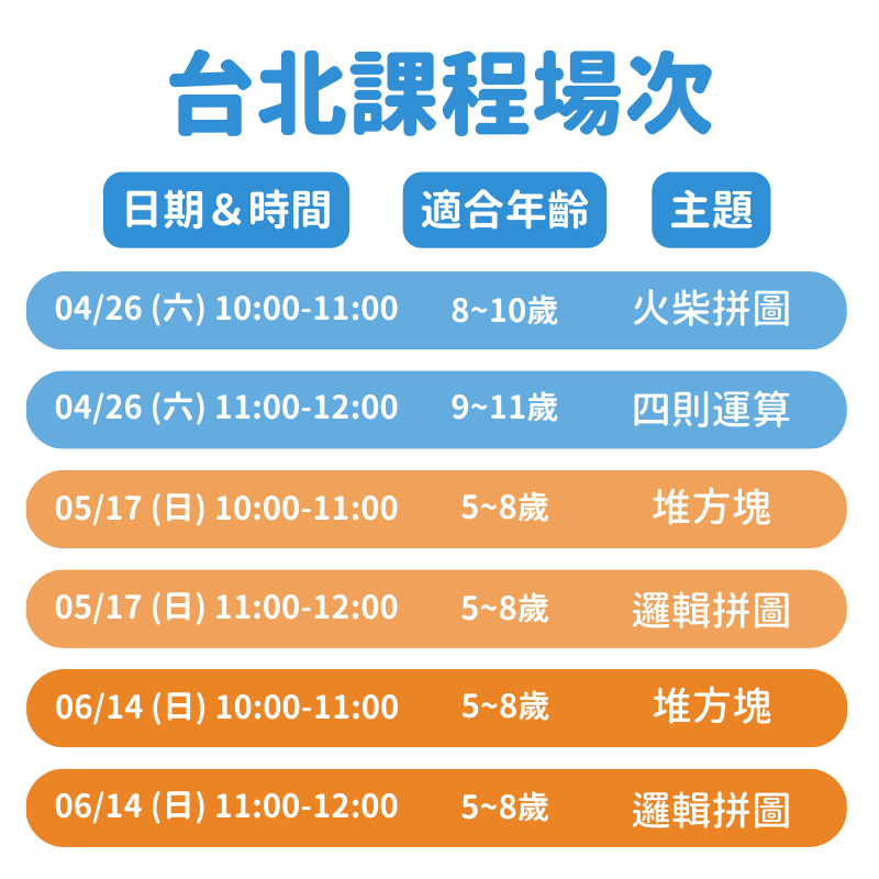 04/26 (六) 10:00-11:00 04/26 (六) 11:00-12:00 05/17 (日) 10:00-11:00 05/17 (日) 11:00-12:00 06/14 (日) 10:00-11:00 06/14 (日) 11:00-12:00