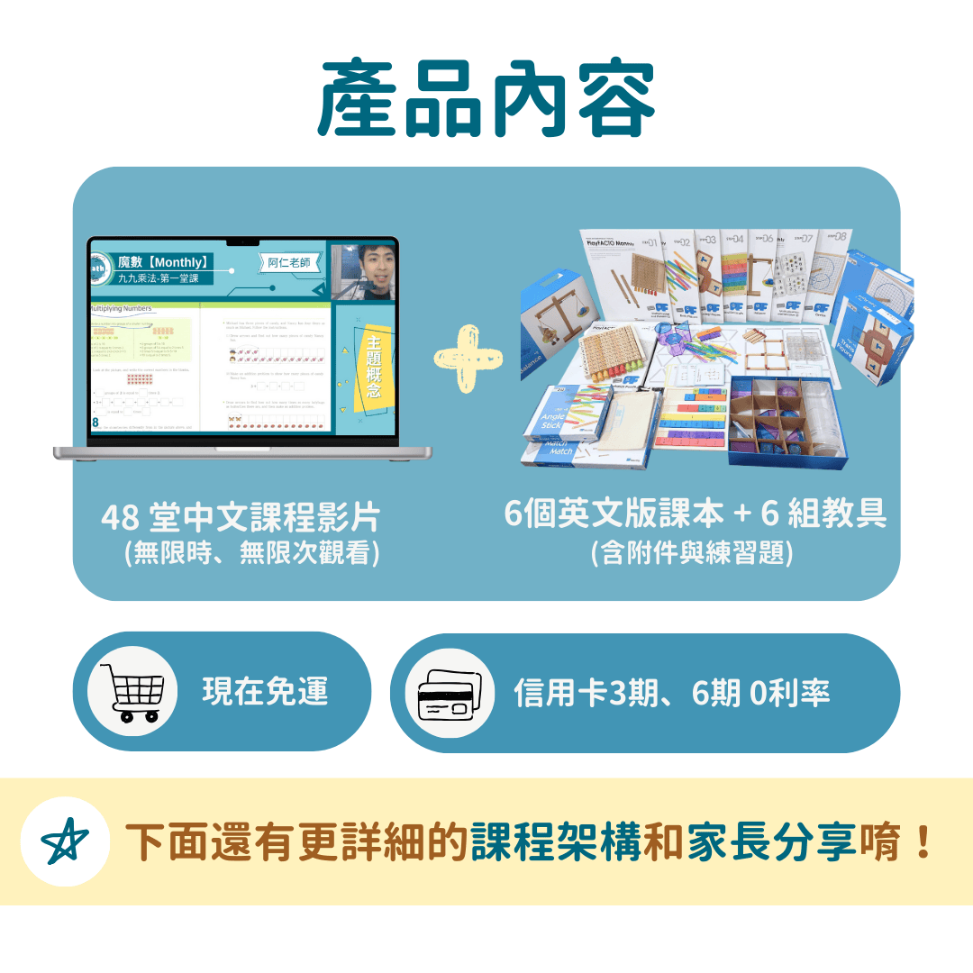 魔數會隨機釋出幾個單購主題,但建議購買整系列,因魔數是一套有系統性的完整數學教材,讓孩子擁有正向數學學習態度,避免只有背公式、背題型、背解法,97%學員也是購買完整的學習組合唷!